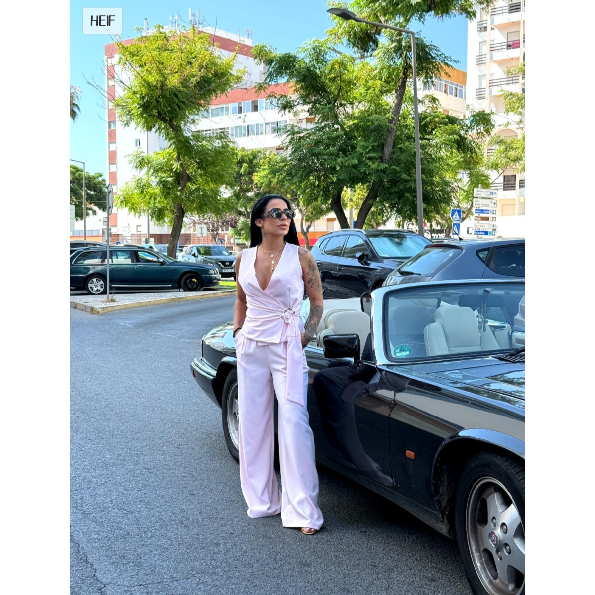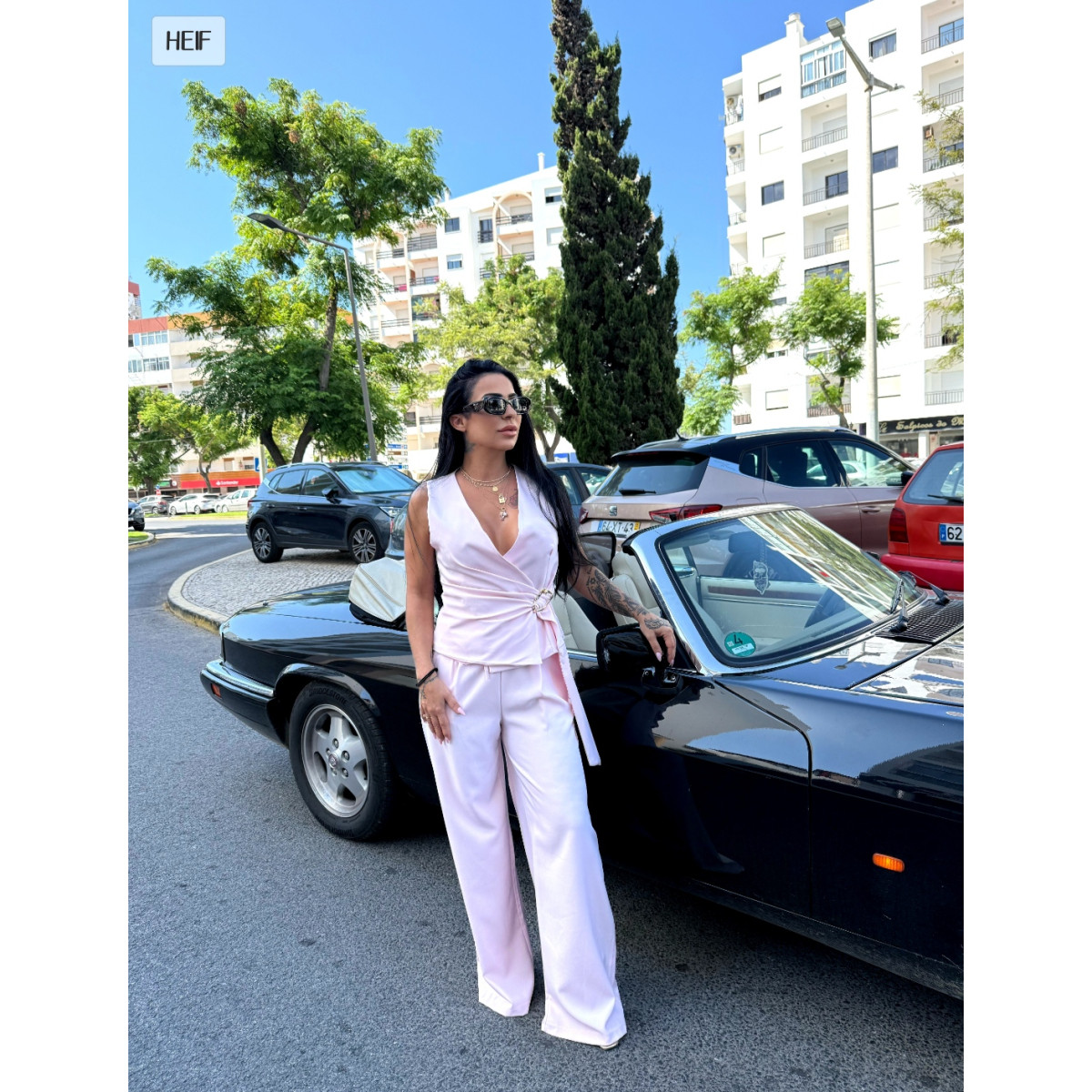 A escolha perfeita para quem quer arrasar com elegância e atitude. Este conjunto destaca-se pelo design cruzado no peito, com decote em V que valoriza o colo e laço lateral ajustável que marca a cintura de forma feminina. As calças de corte reto alongam a silhueta, garantindo conforto e sofisticação em qualquer ocasião — seja para um passeio de verão, um jantar especial ou um evento mais formal.