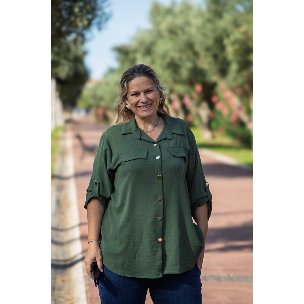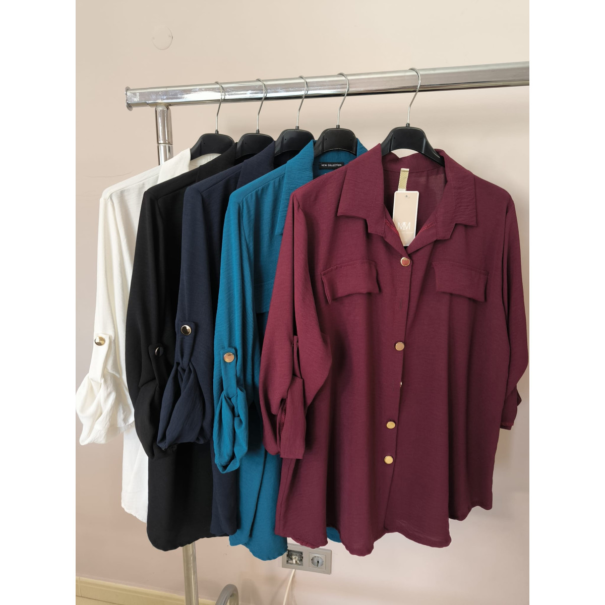 Com o seu corte fluido e botões frontais, oferece um visual moderno e descontraído, perfeito para diversas ocasiões — desde o trabalho até um passeio ao ar livre.