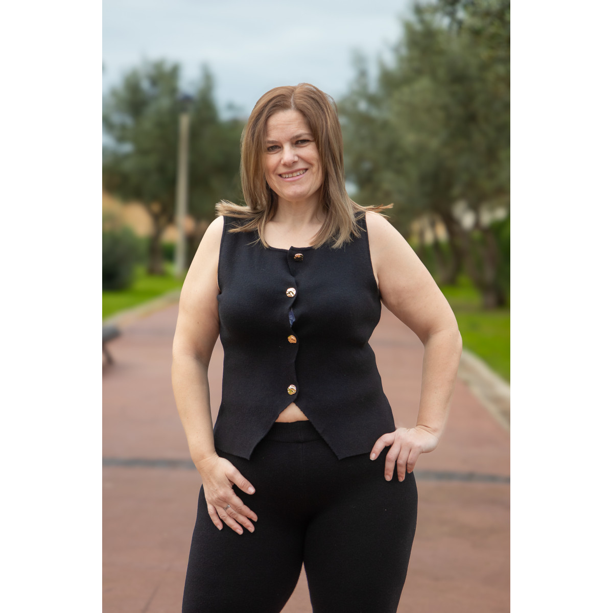 Conjunto composto por colete e calça.