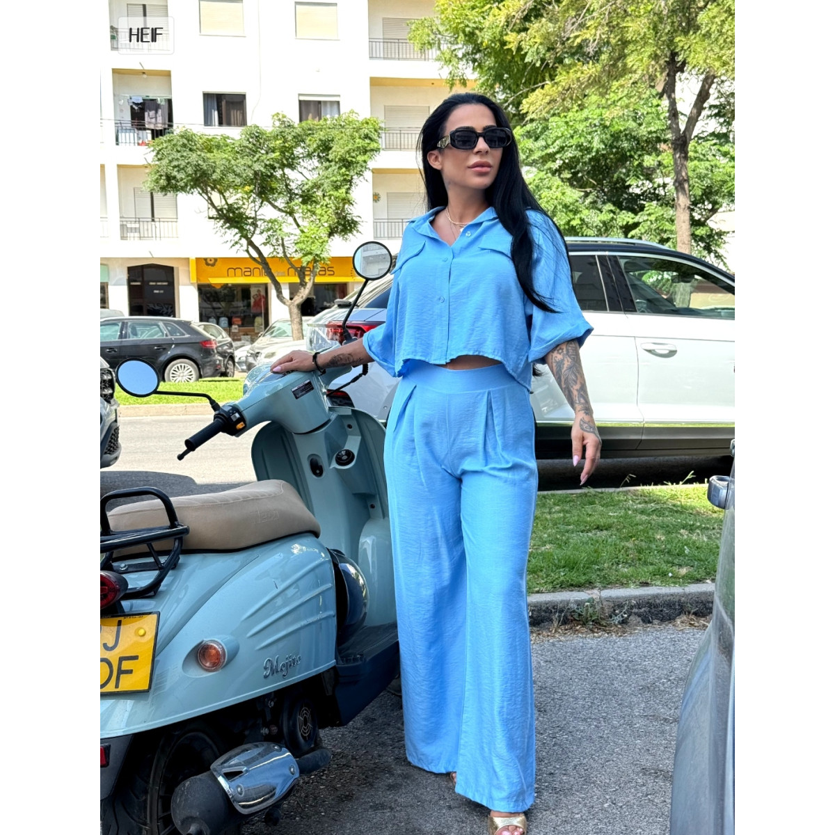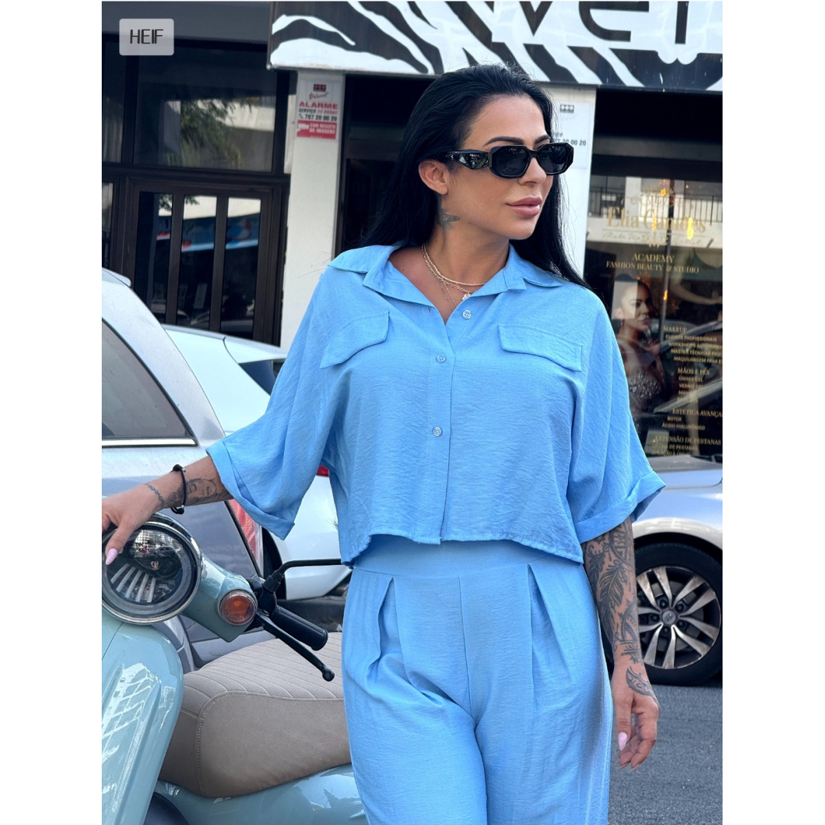 O Conjunto Jade é a escolha ideal para quem quer estar elegante sem abrir mão do conforto. Composto por uma camisa cropped de manga curta e calça fluida de cintura alta, ele combina leveza e sofisticação num só look.